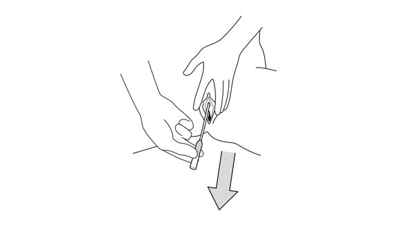 Sära på blygdläpparna och lokalisera urinröret strax ovanför vaginalöppningen. Med den andra handen, för långsamt in katetern i urinröret.