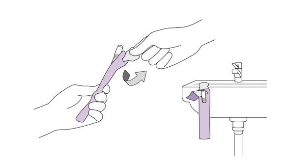 När urinen börjar rinna ska du föra in katetern något längre för att säkerställa att båda kateterögonen är inne i blåsan.