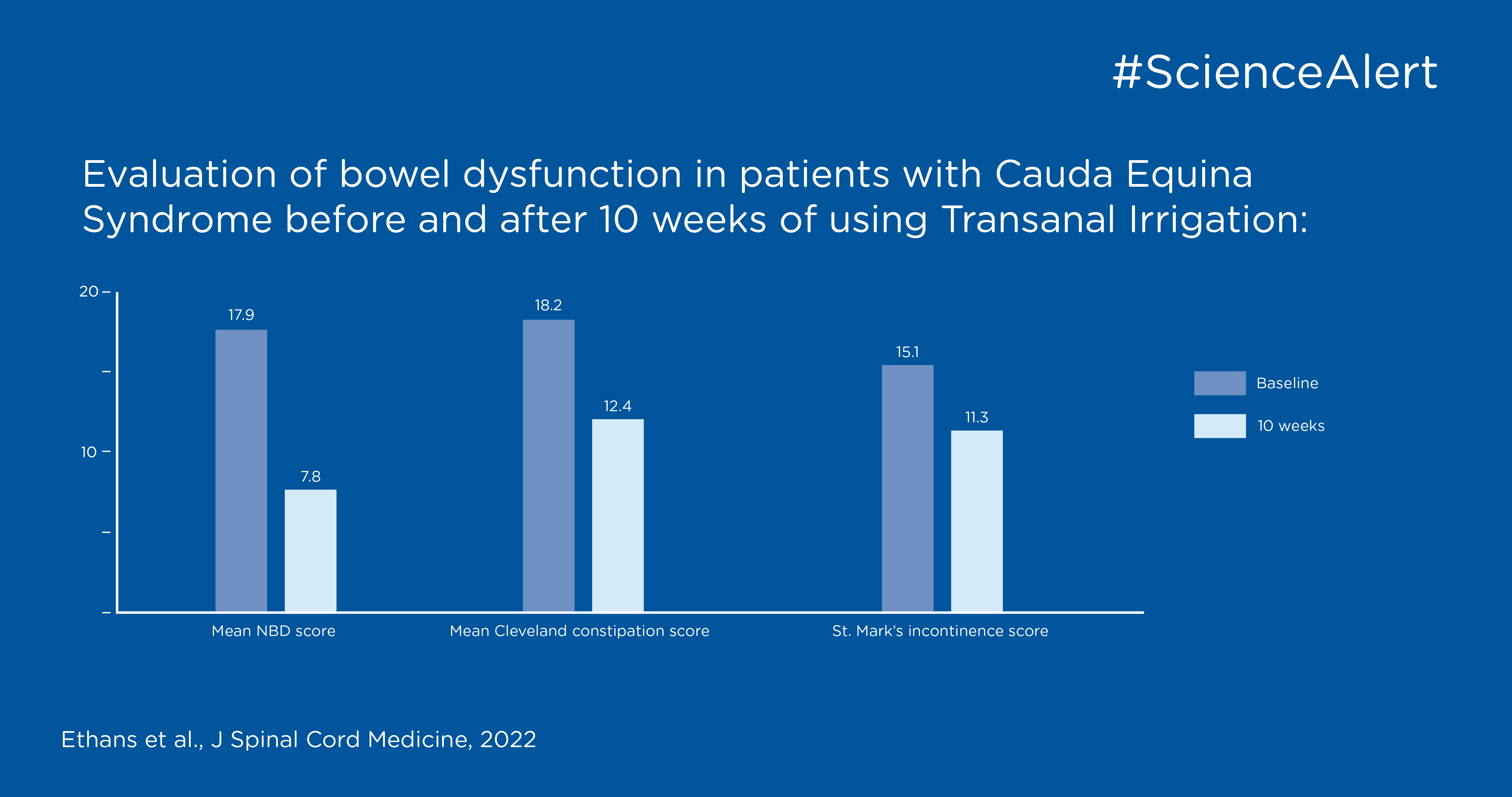 Ethans et al performed this small study to evaluate the efficacy of transanal irrigation (TAI) in people with cauda equina syndrome (CES). They included 12 individuals with CES that used TAI for 10 weeks and evaluated changes in bowel function with the neurogenic bowel dysfunction (NBD) score.