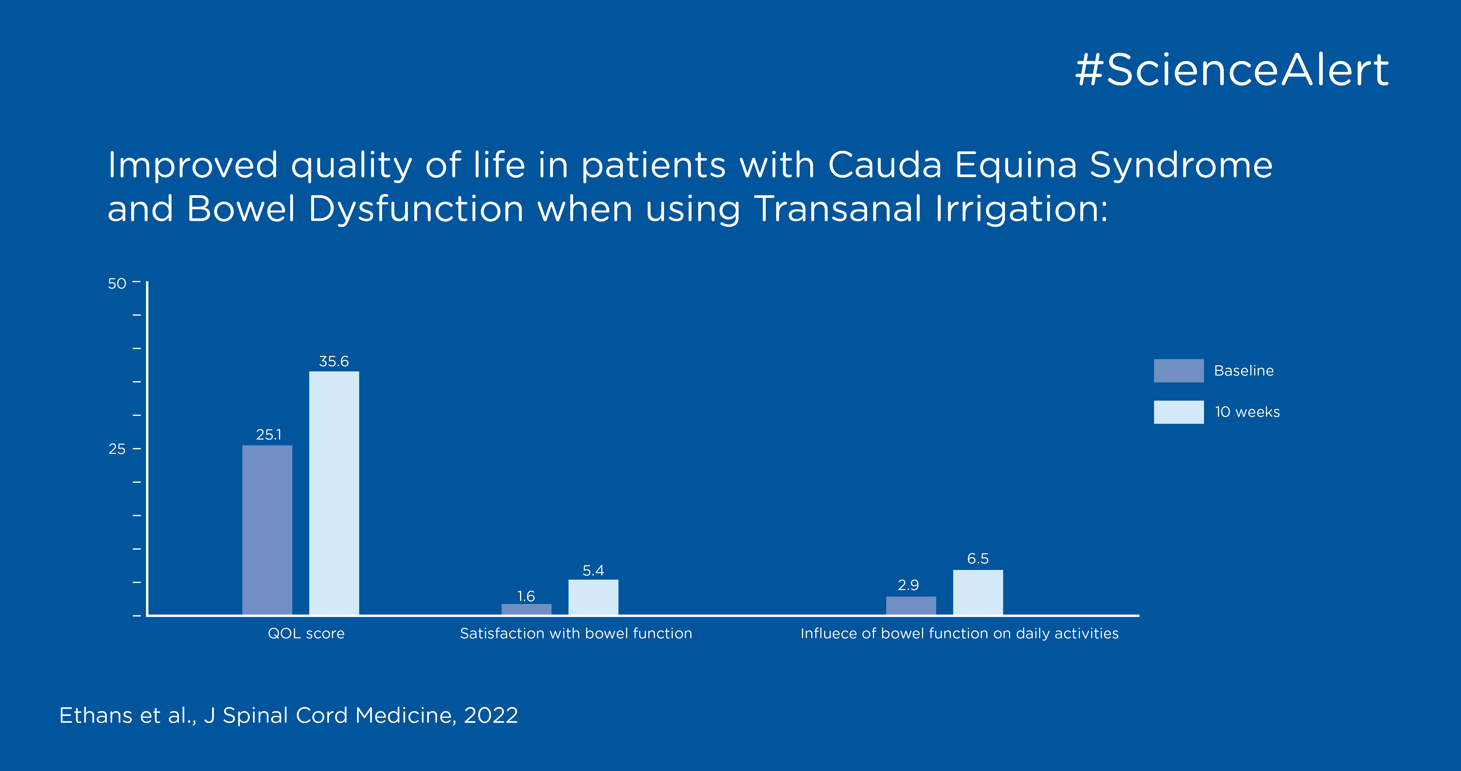 All of the above was significantly improved after 10 weeks use of TAI, which supports the use of TAI in this patient population. The authors conclude that this non-pharmacological bowel management is safe, effective and has the potential to improve the quality of life for patients with CES and neurogenic bowel dysfunction.