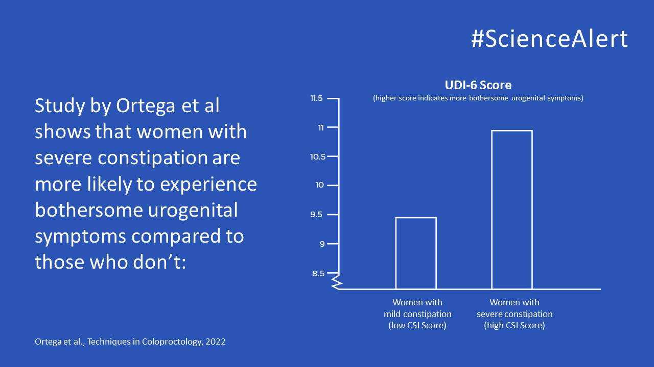 Ortega et al conducted this retrospective study at a pelvic floor disorder center to evaluate the impact of constipation on urogenital symptoms in women. Bowel problems in women are hypothesized to be associated with the presence and severity of urogenital symptoms and linked to pelvic floor dysfunction. Causes of chronic constipation in women vary, but clinical studies show a link to pelvic floor dysfunction, where as many as 50% of people with constipation also have pelvic floor dysfunction. However, it does not show if it is the pelvic floor dysfunction that causes constipation or the opposite. What is known is that bowel emptying and urinary physiology share neural pathways, which explains the co-existence of symptoms.