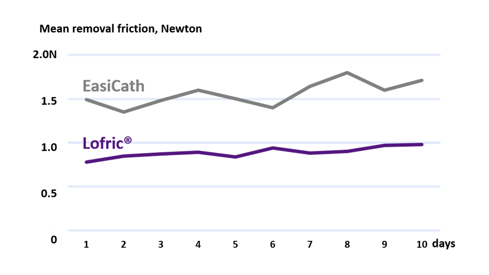 Cross-over study of LoFric and another hydrophilic catheter in 14 users providing evidence that high osmolality of the hydrophilic coating results in less sticking and lower withdrawal friction. For example, 3 incidents of sticking were observed in 2 patients among LoFric users while 42 incidents of sticking were observed in 9 patients among users of another hydrophilic catheter.