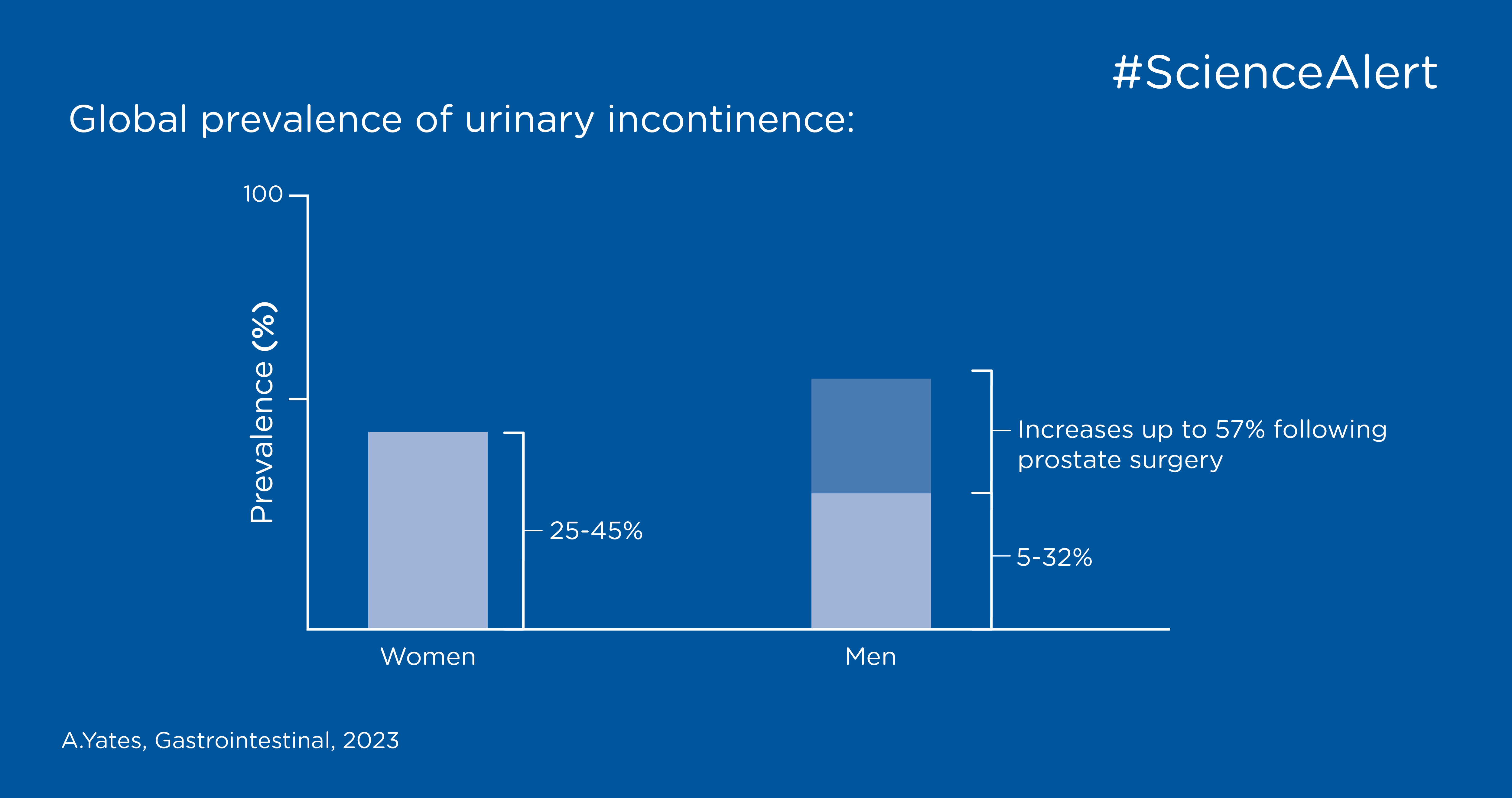 Urinary incontinence is very common worldwide and has been identified as a health priority by the World Health Organization (WHO). The prevalence rates differ between studies, mainly due to the use of different definitions which makes comparisons challenging. Globally, urinary incontinence in women has a reported prevalence of 25-45%. In men urinary incontinence is often caused by previous surgery to remove the prostate and the prevalence of urinary incontinence ranges from 5 - 57 %. For both men and women, the figures increase with age.