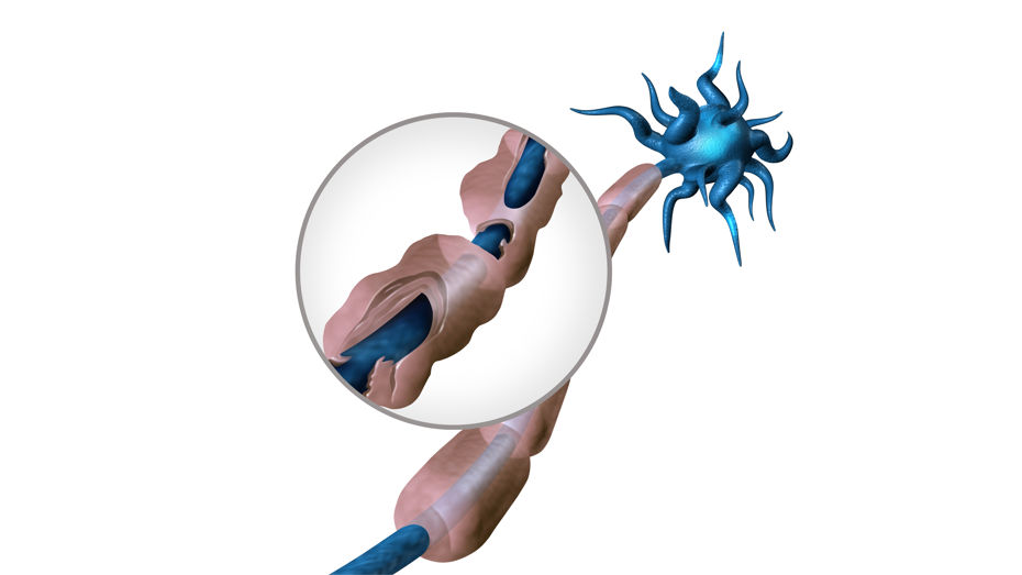 Vid MS attackerar kroppens immunförsvar av misstag myelinvävnaden, vars funktion är att skydda nervfibrerna i centrala nervsystemet och säkerställa en smidig överföring av kommunikation mellan hjärnan och kroppen. Dessa attacker skadar den skyddande myelinvävnaden (s.k. demyelinisering) och nervcellerna, så att kommunikationen inte kan överföras korrekt.